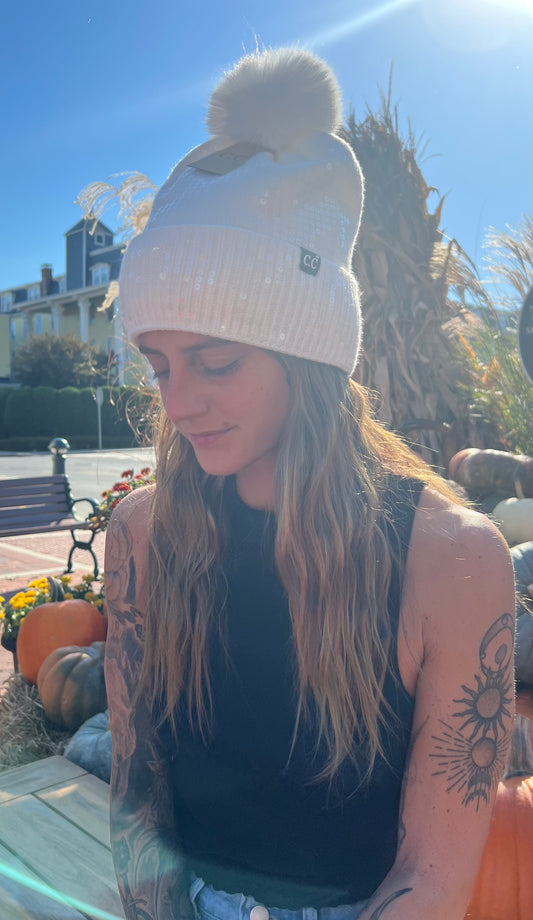 Sequin Ivory CC knit beanie With Pompom