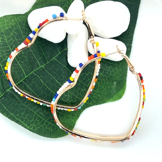 Seed Bead Heart Shaped Gold Tone Hoop Earrings