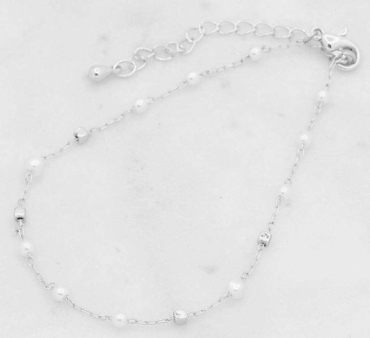 Dainty Pearl Spaced Chain Link Bracelet - Silver