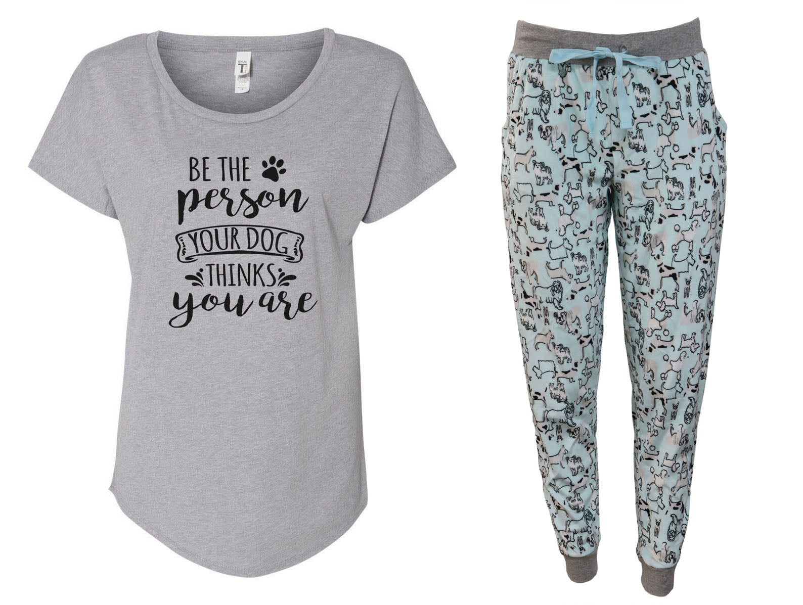 Our Be The Person Your Dog Thinks You Are Baby Blue Puppy Jogger Pajama Set is printed on a Grey Next Level #1560 Ideal Dolman T-Shirt.