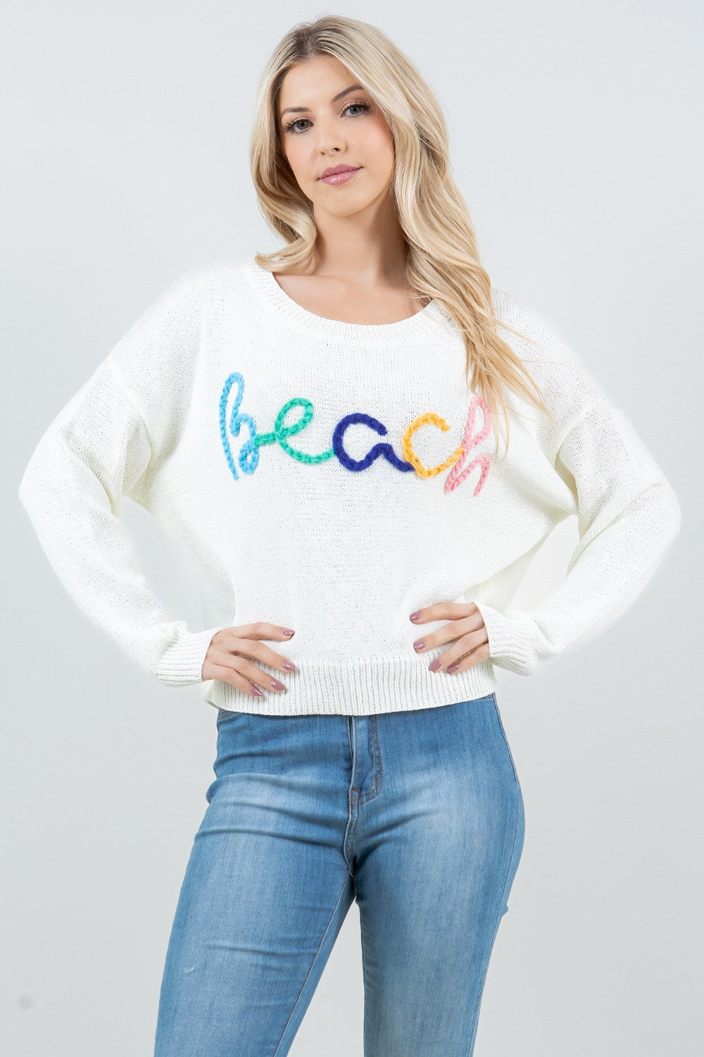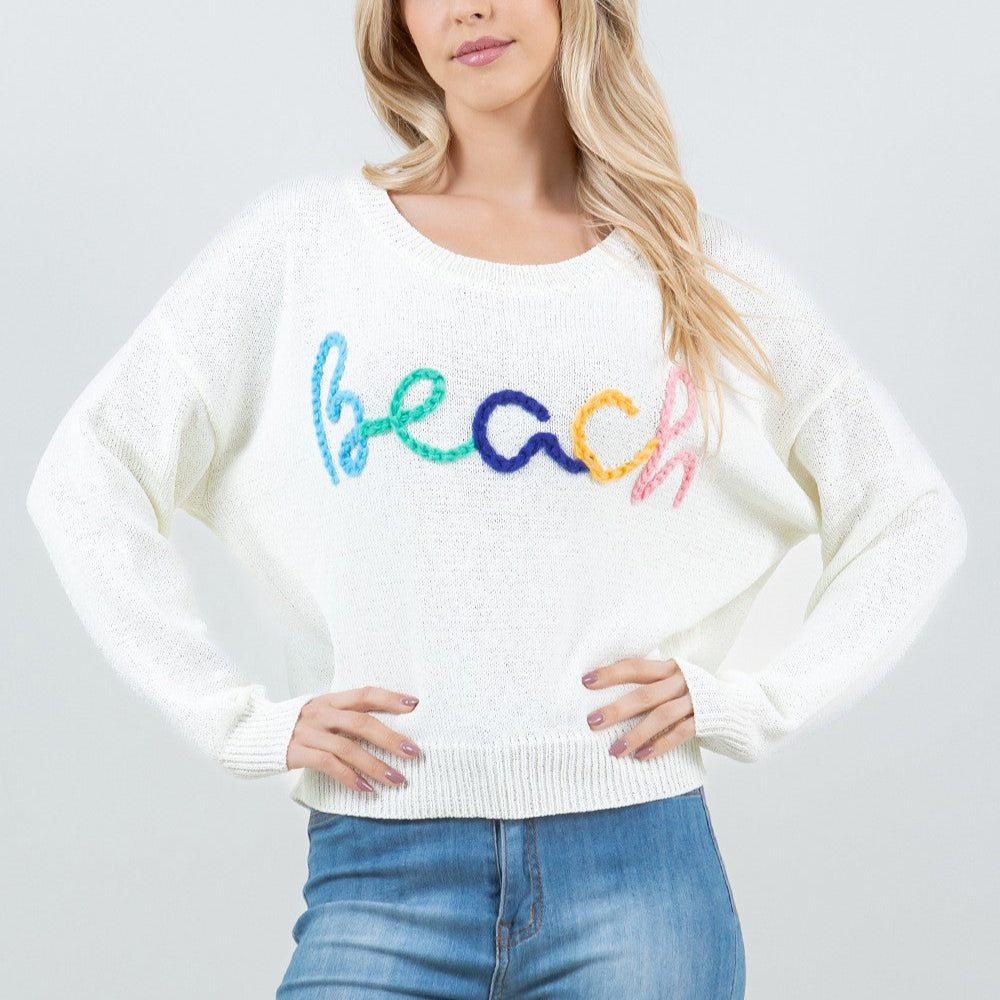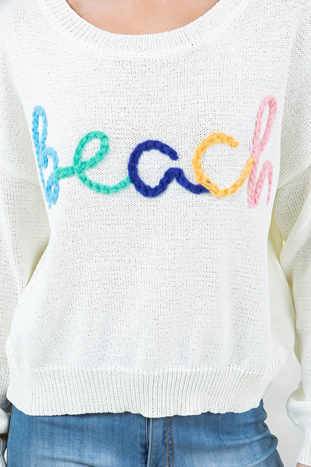 This oversized ivory knit sweater features intricate stitching of the word "beach" in colorful chunky yarns, adding a pop of color to the elegant design. Made of 100% polyester, this oversized crewneck sweater is perfect for any sophisticated and fashionable occasion. Model is 5'8" tall and wears a size S/M, with measurements of 32-24-36.