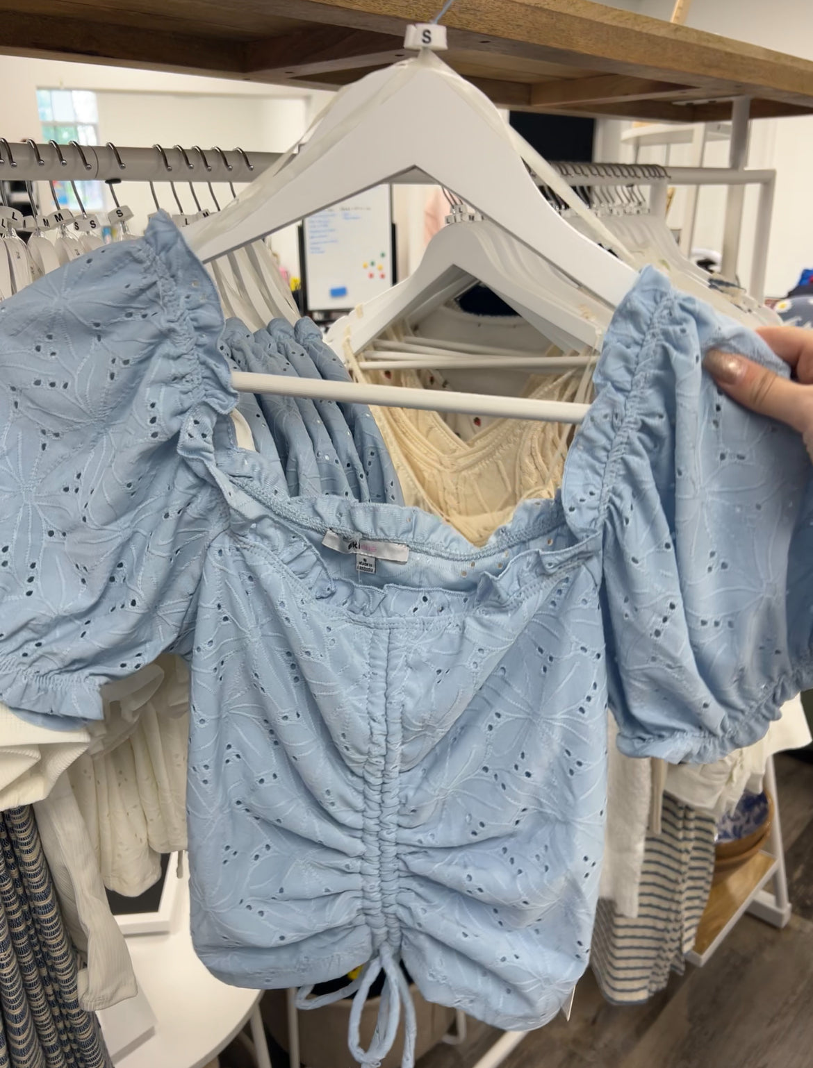 Front Ruched Short Puff Sleeve Eyelet Top - Baby Blue