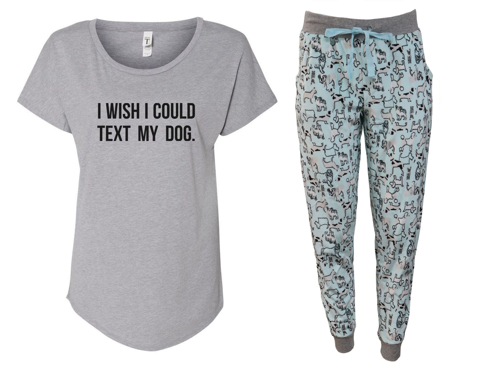 Our I Wish I Could Text My Dog Baby Blue Puppy Jogger Pajama Set is printed on a Grey Next Level #1560 Ideal Dolman T-Shirt.