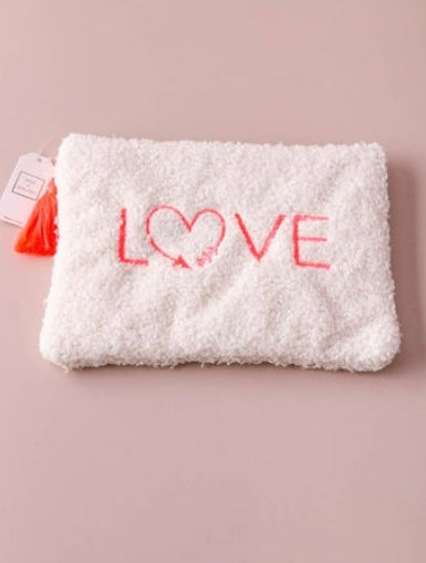 Neon Orange Love & Heart Fuzzy Cream Make Up Bag With Neon Tassel