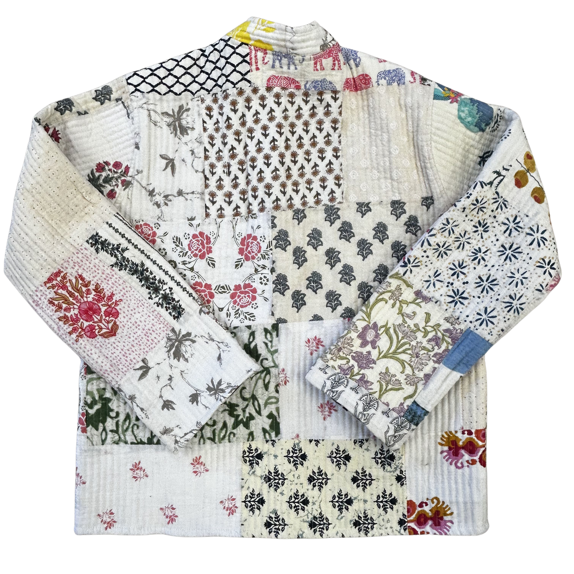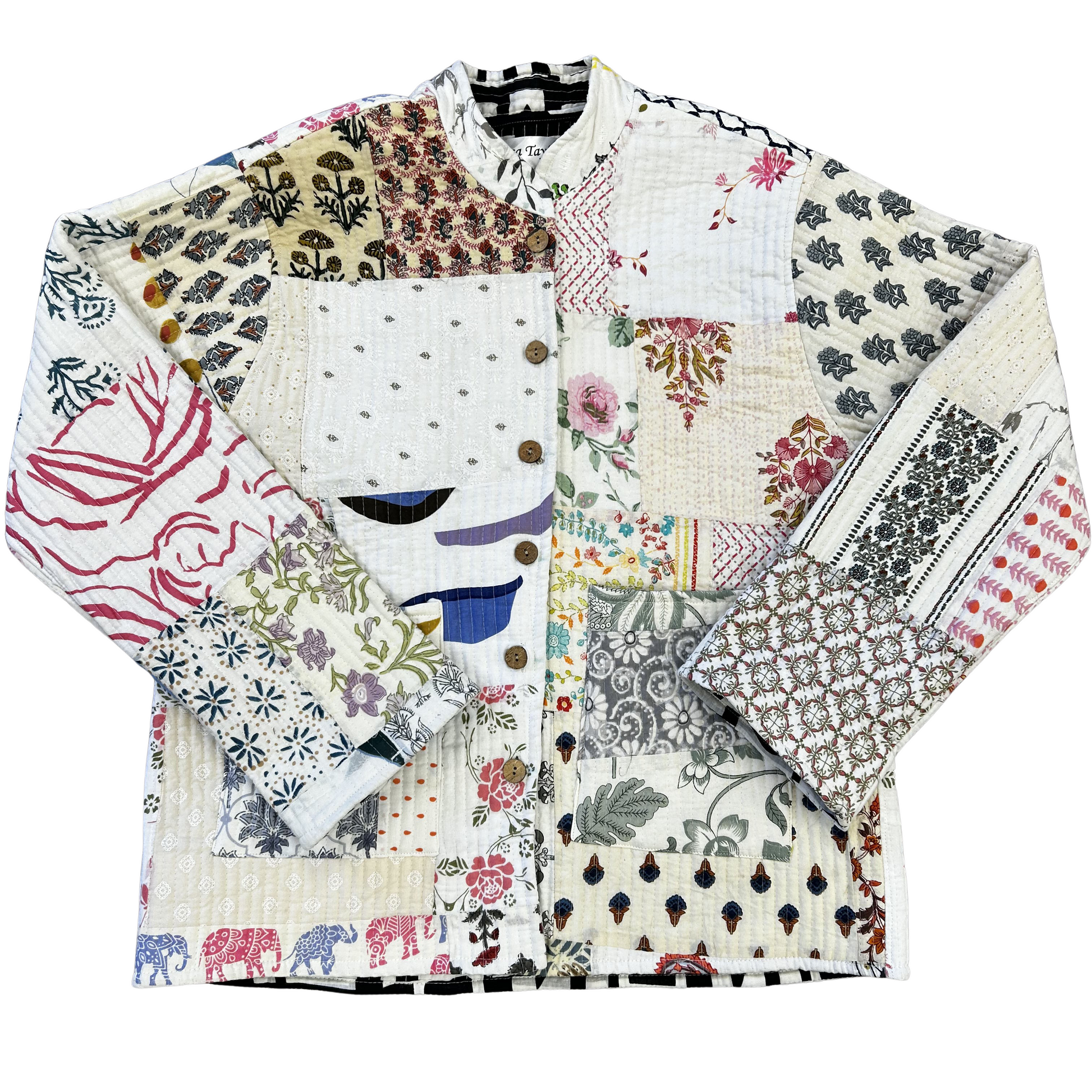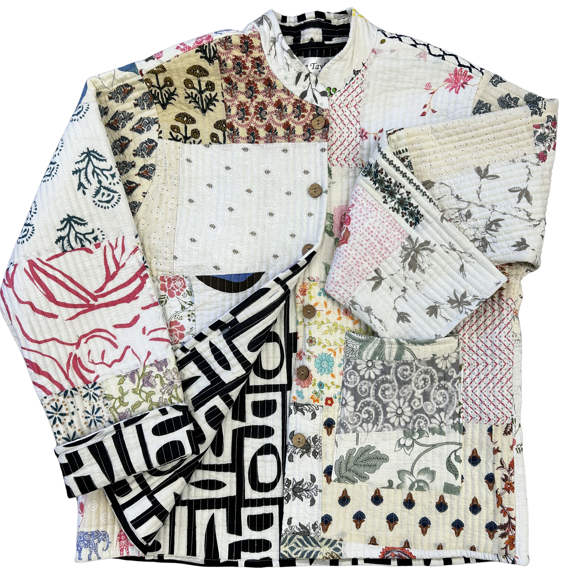 Not only is this Jessica Taylor quilted jacket perfect for any event, it's a one-of-a-kind piece that will set you apart from the crowd. With its cozy, patchwork pattern and chic collar, you'll exude effortless style. The added convenience of 2 large front pockets and wooden buttons make it a must-have for any fashion-forward individual (because who wants to carry a purse at a party?) Plus, the mix of vintage and floral fabrics adds a touch of whimsy to this classic jacket. This jacket is quilted throughout and each one is completely unique.