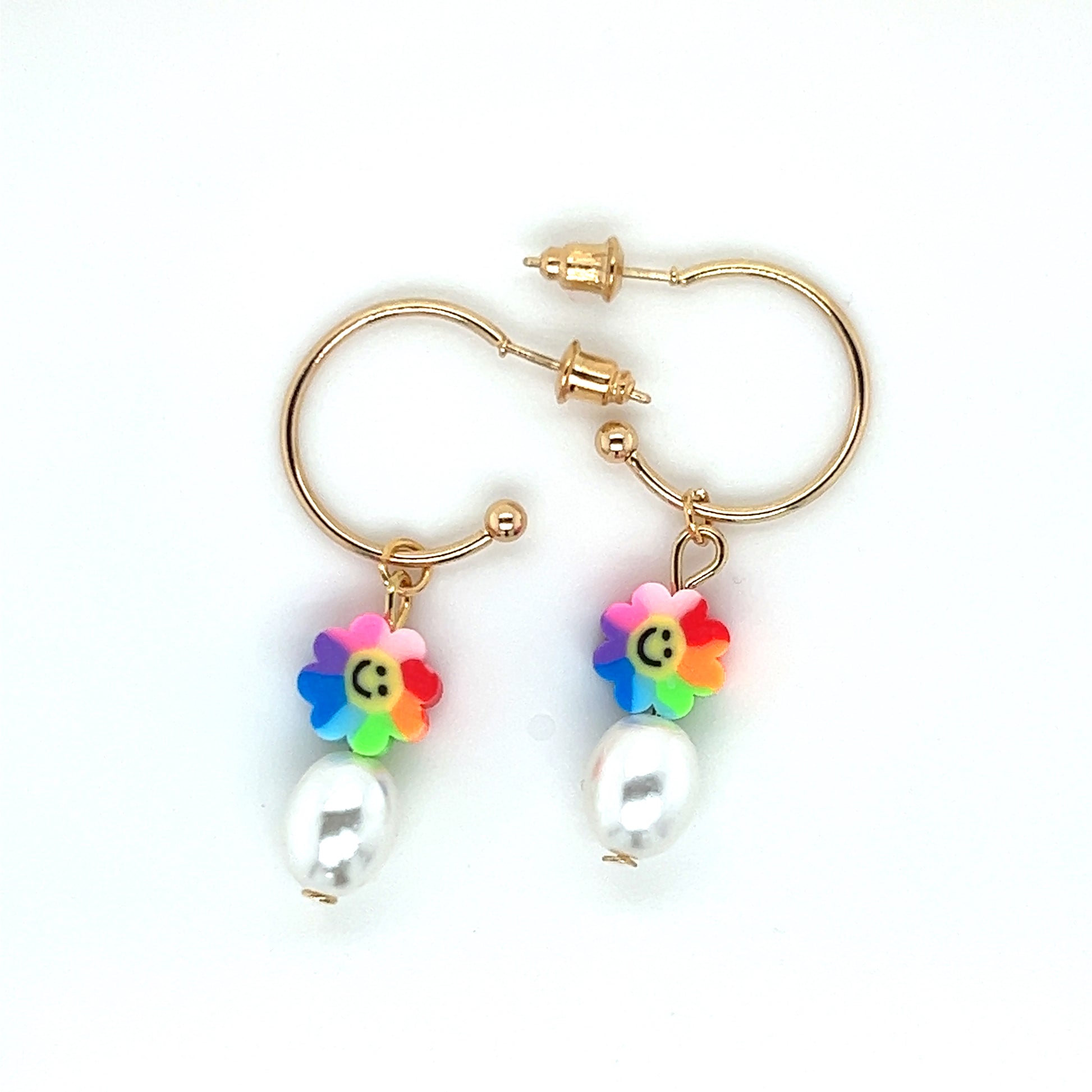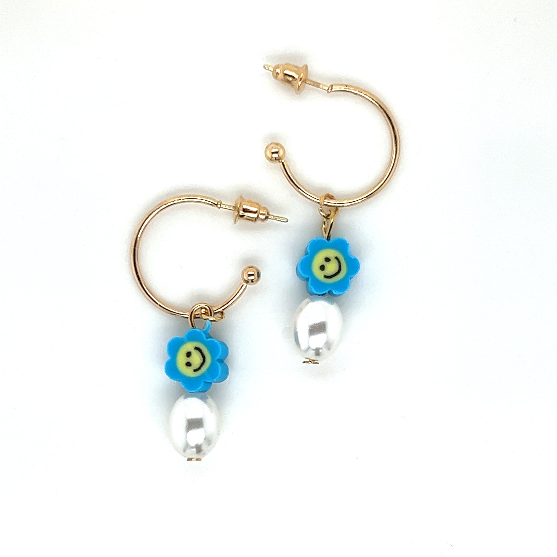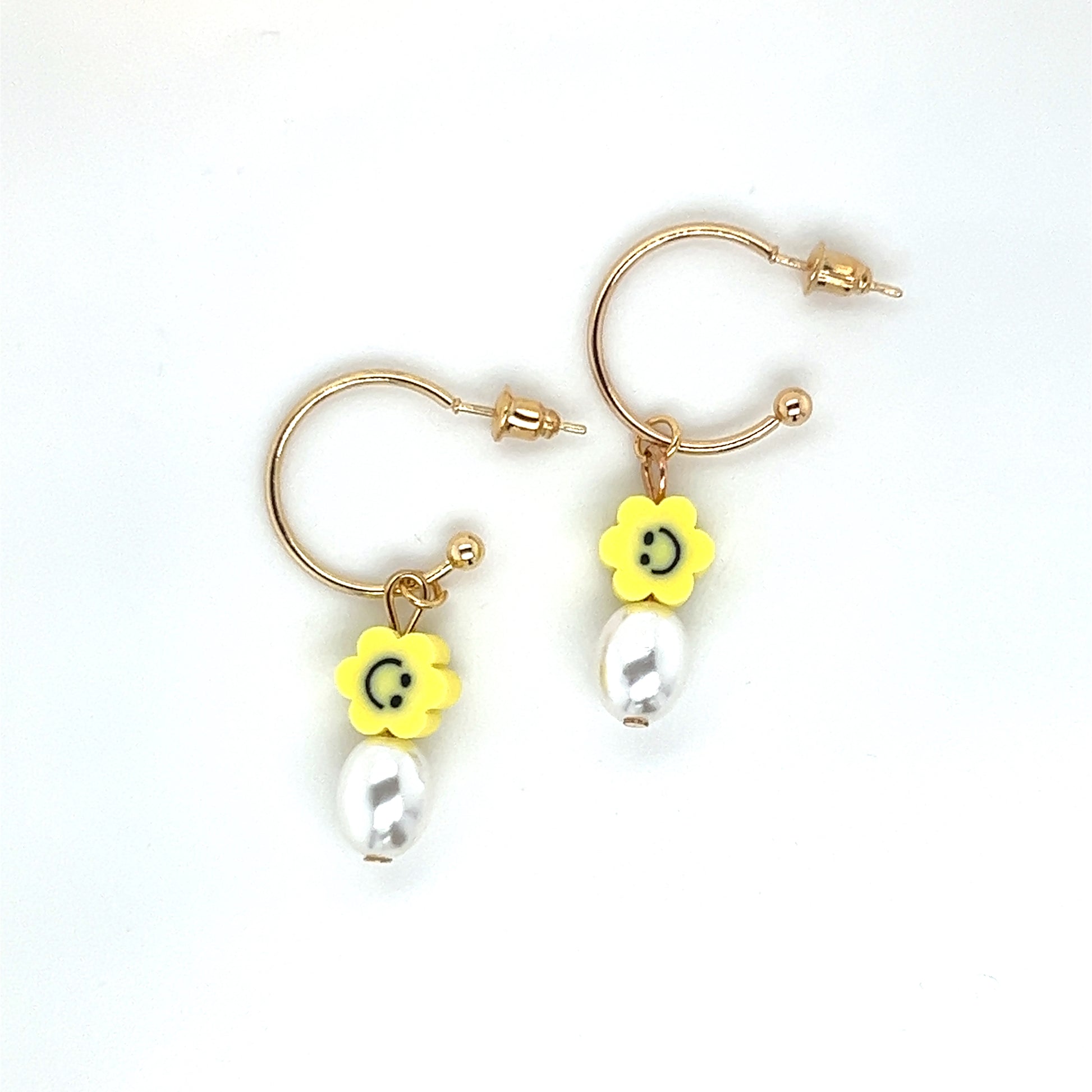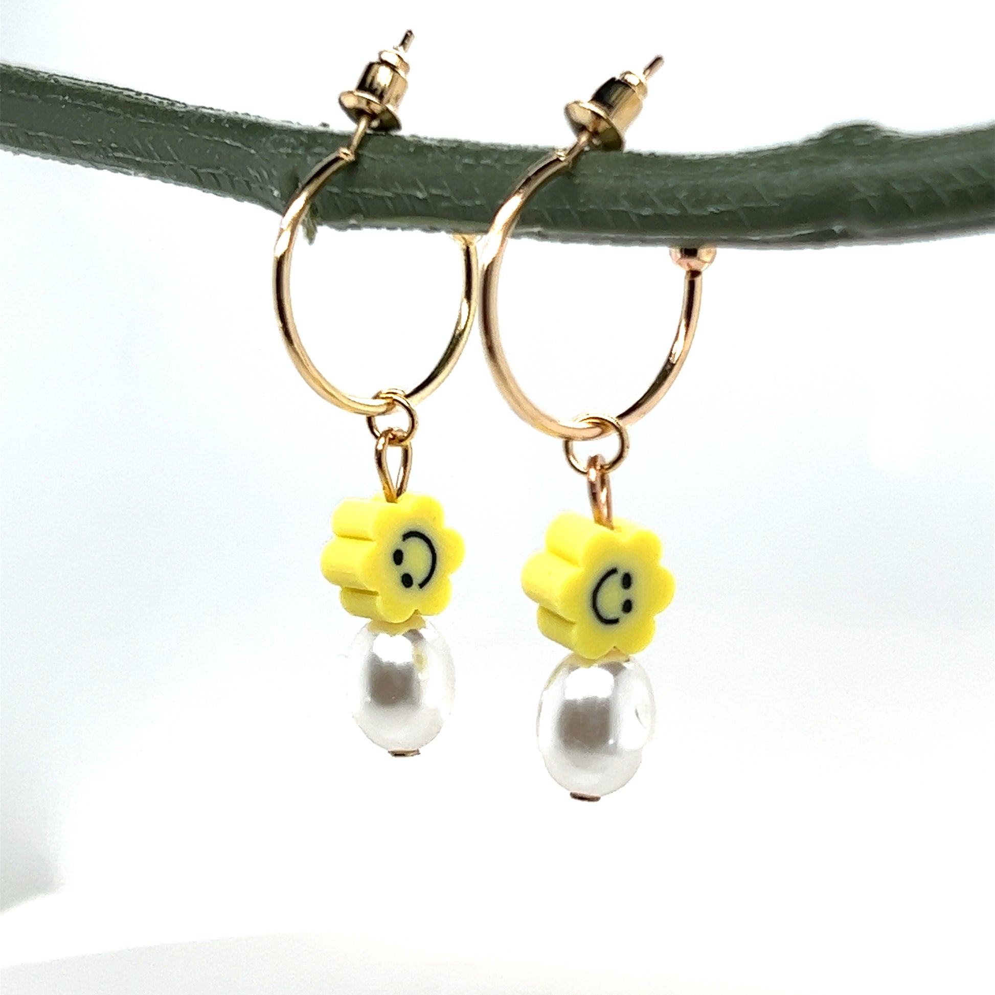 Smiley Flower & Pearl Open Hoop Gold Tone Dangle Earring