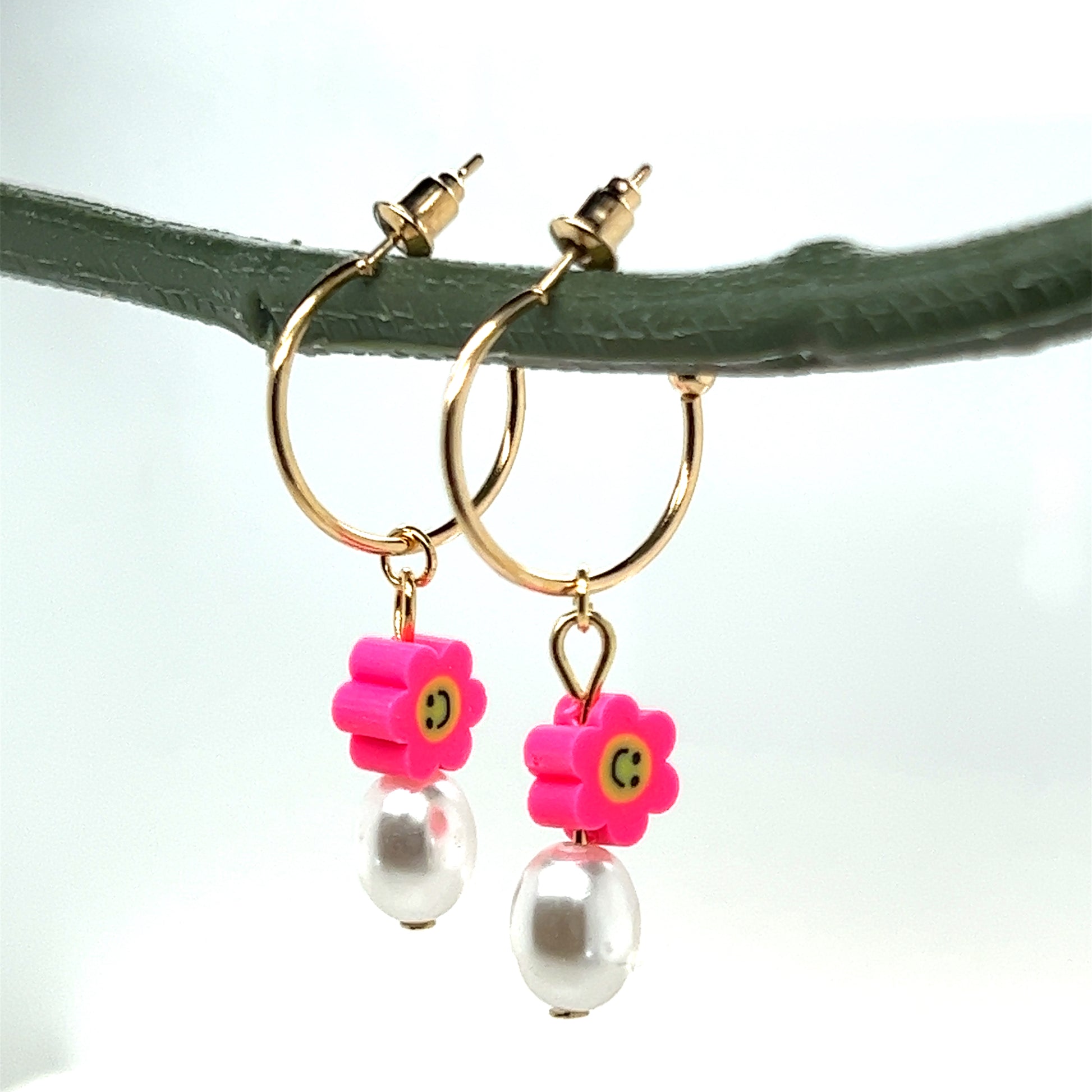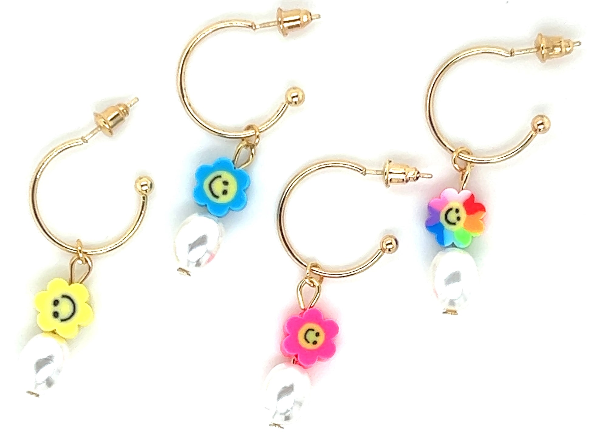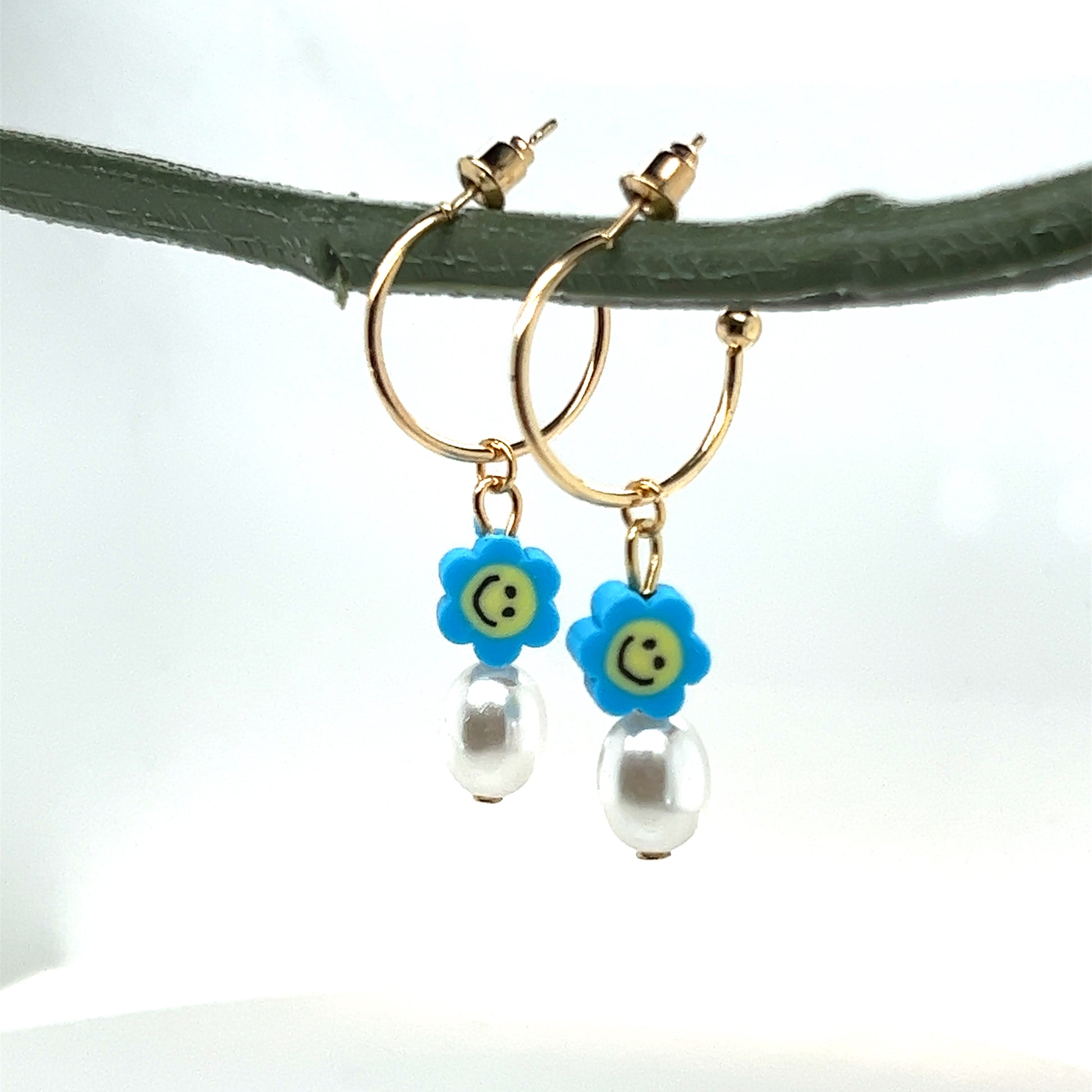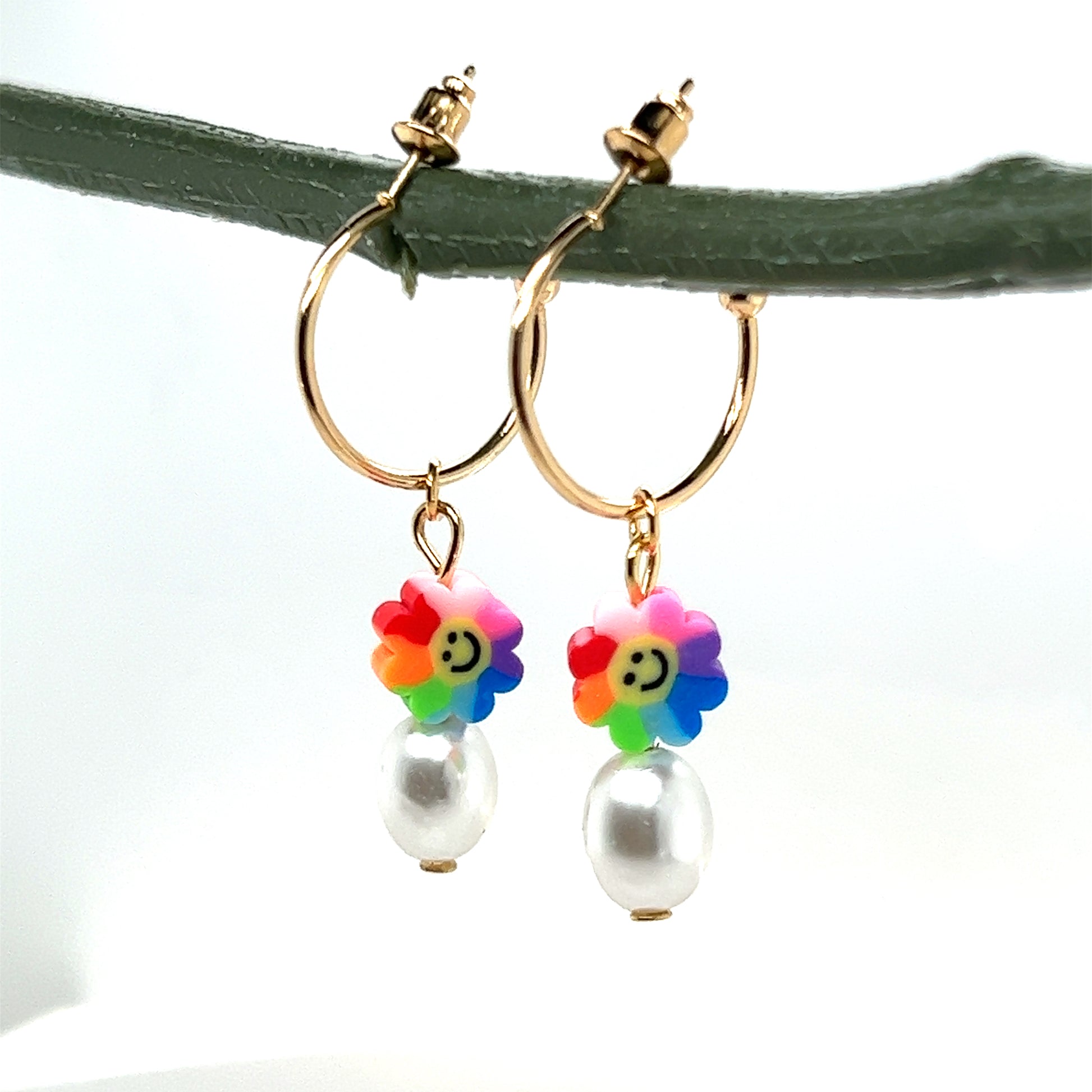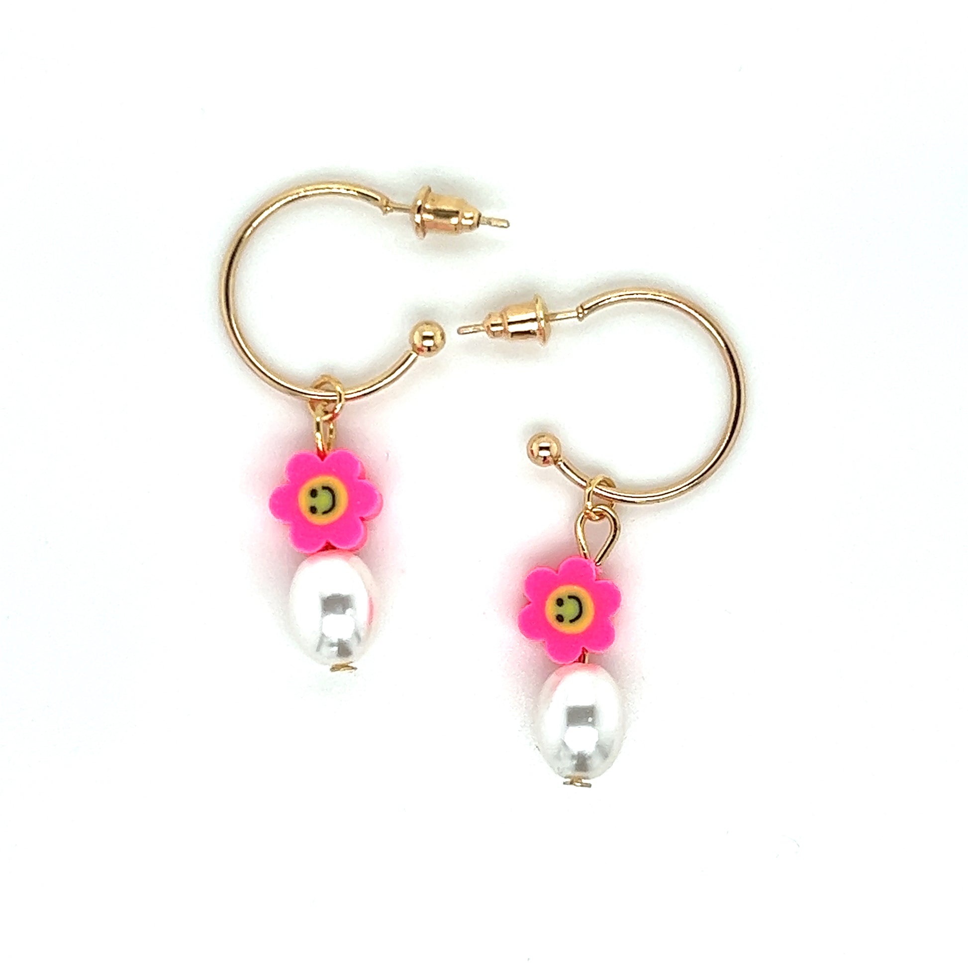 Smiley Flower & Pearl Open Hoop Gold Tone Dangle Earring
