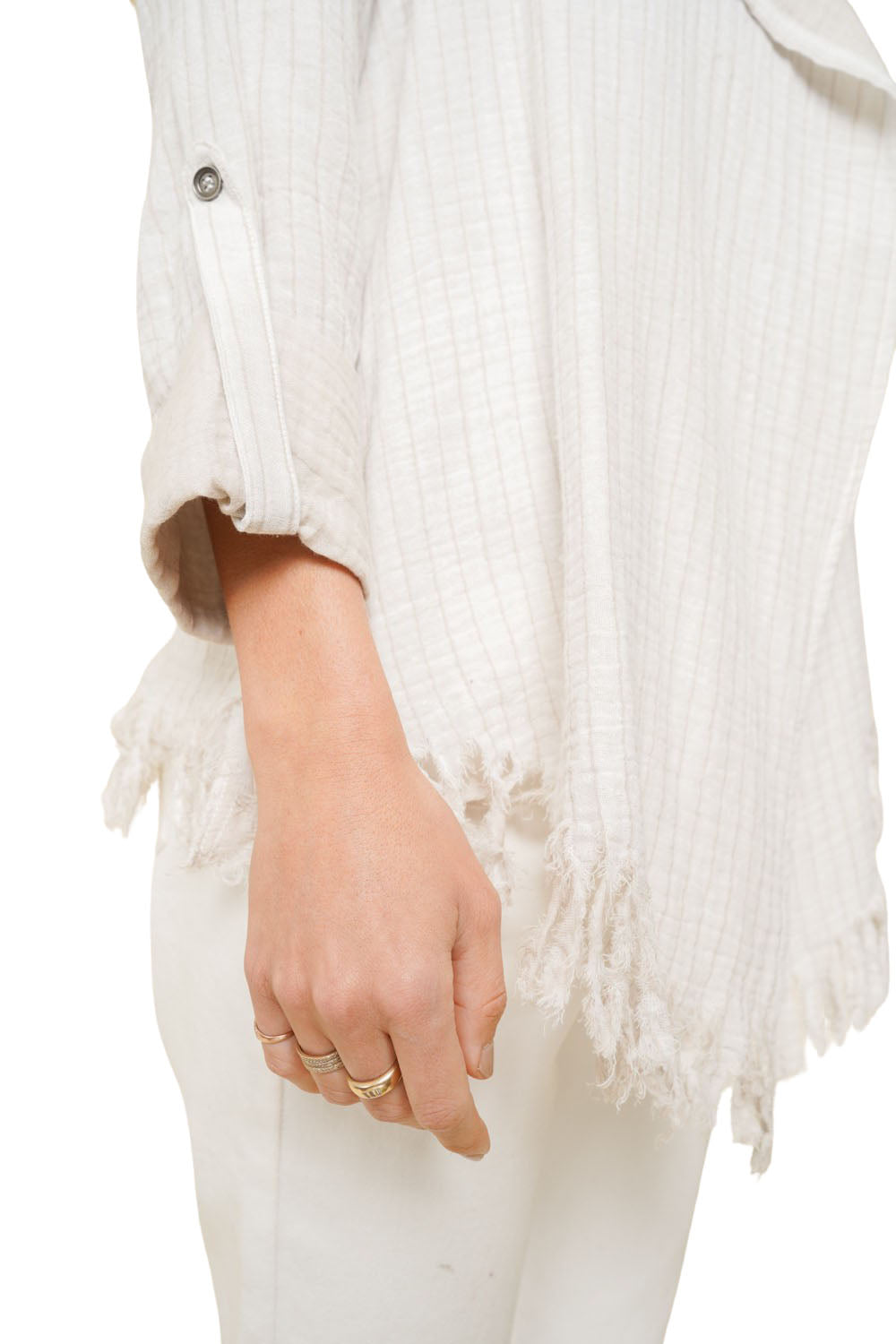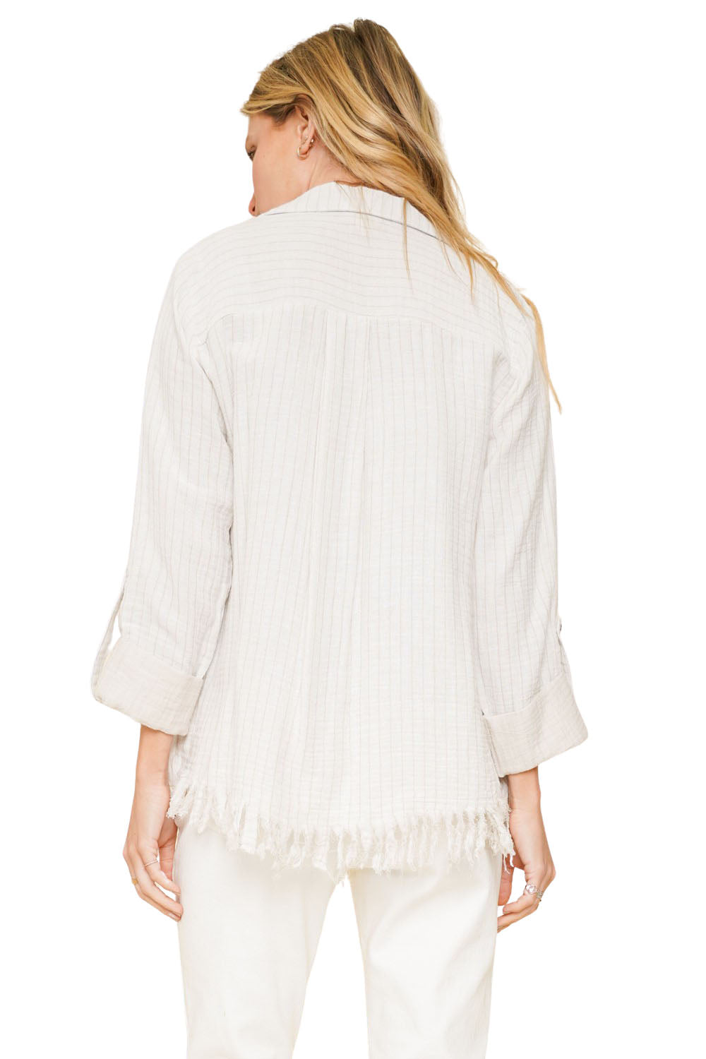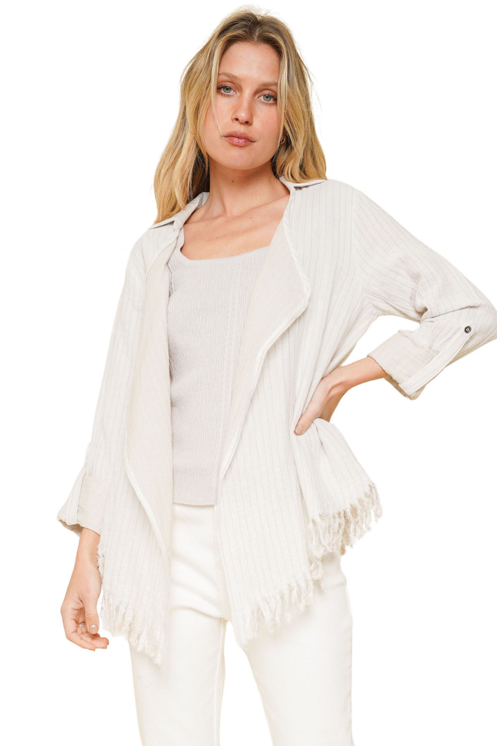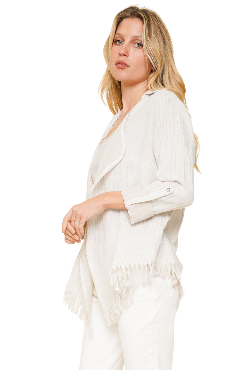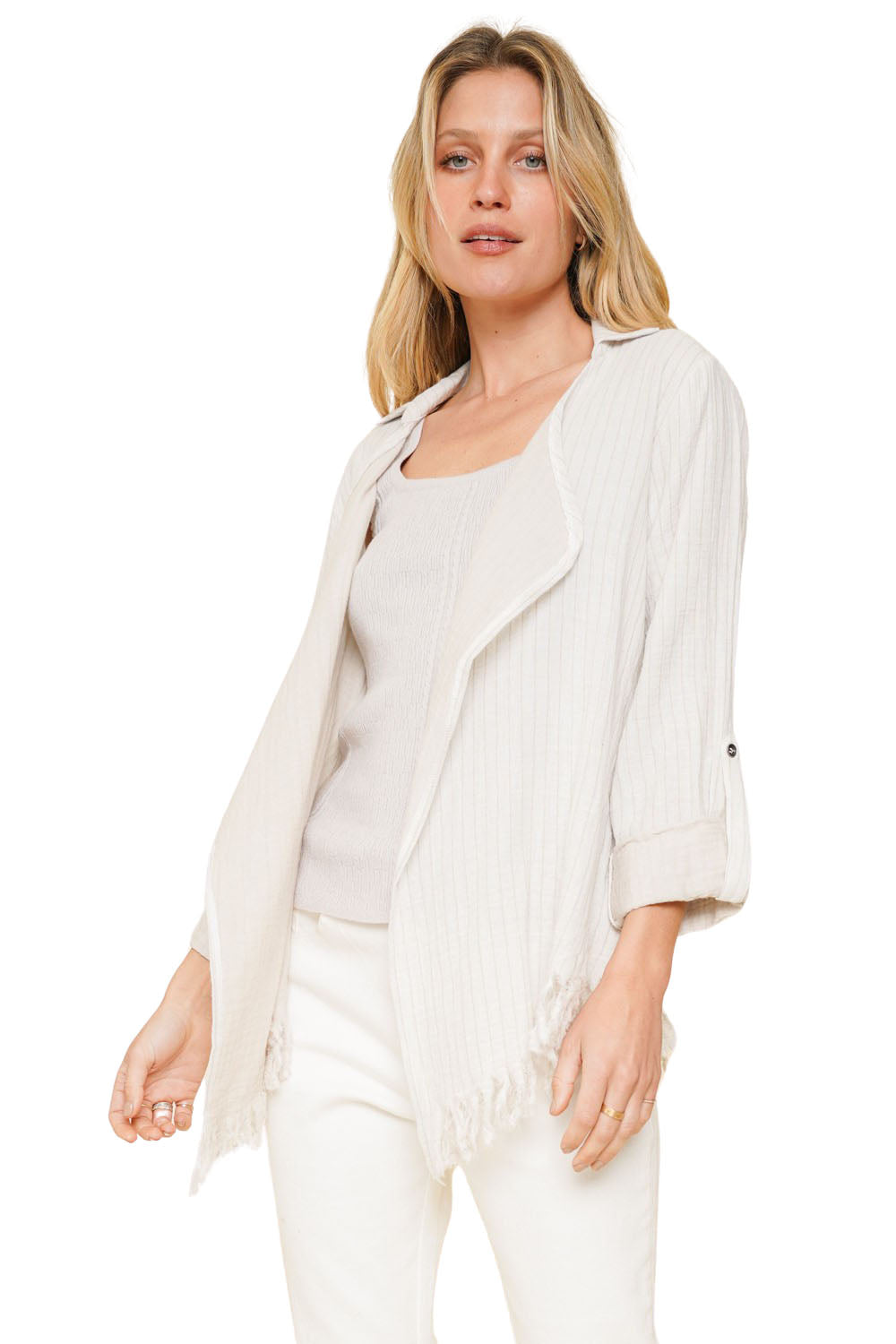 Beach mode activated! This 100% cotton open cardigan has a fun fringe bottom hem, and button back sleeves. The oatmeal stripes blend easily in the ivory white base. Longer in the front, this blazer style cardi does not have any front closure. Double layered, it's softer than you think.