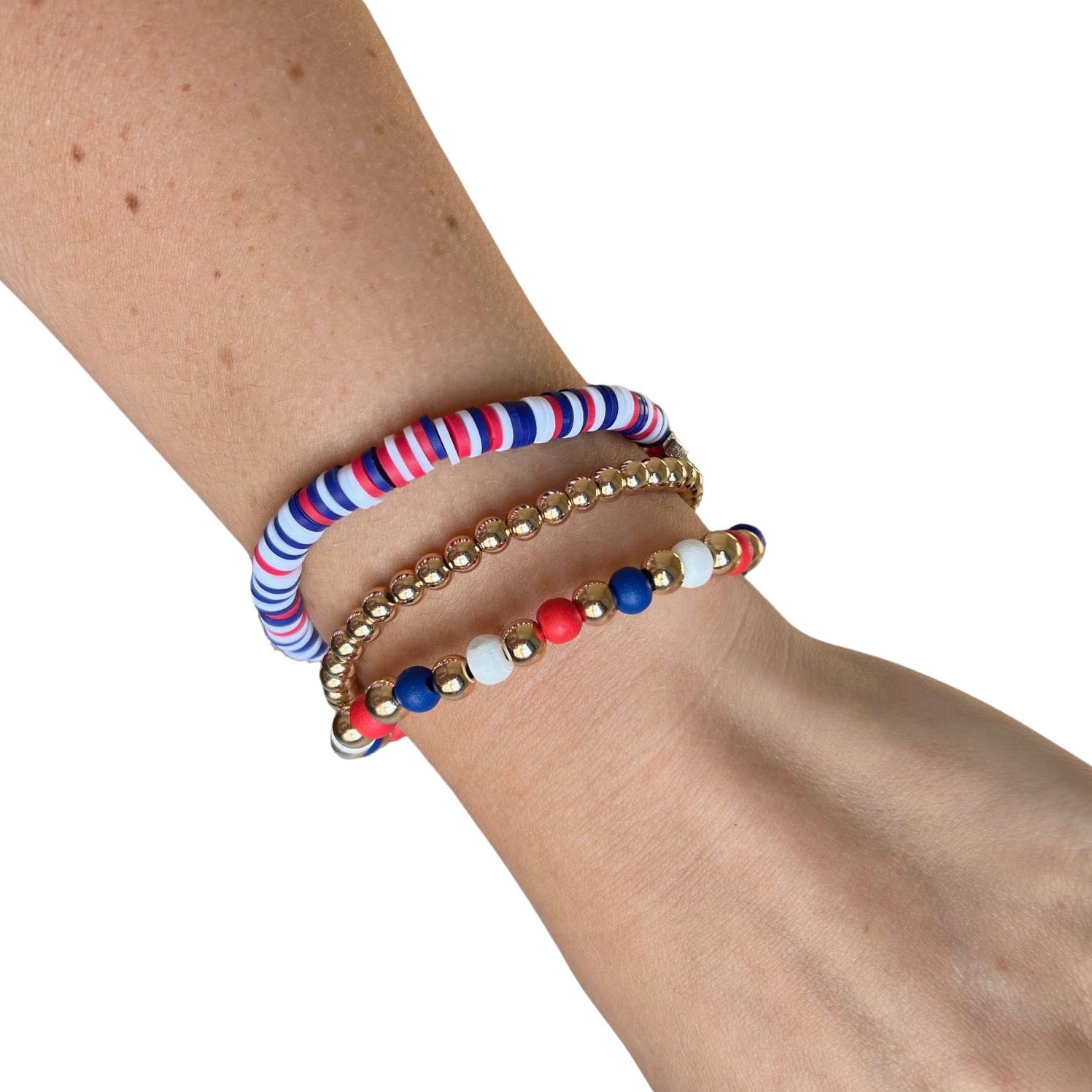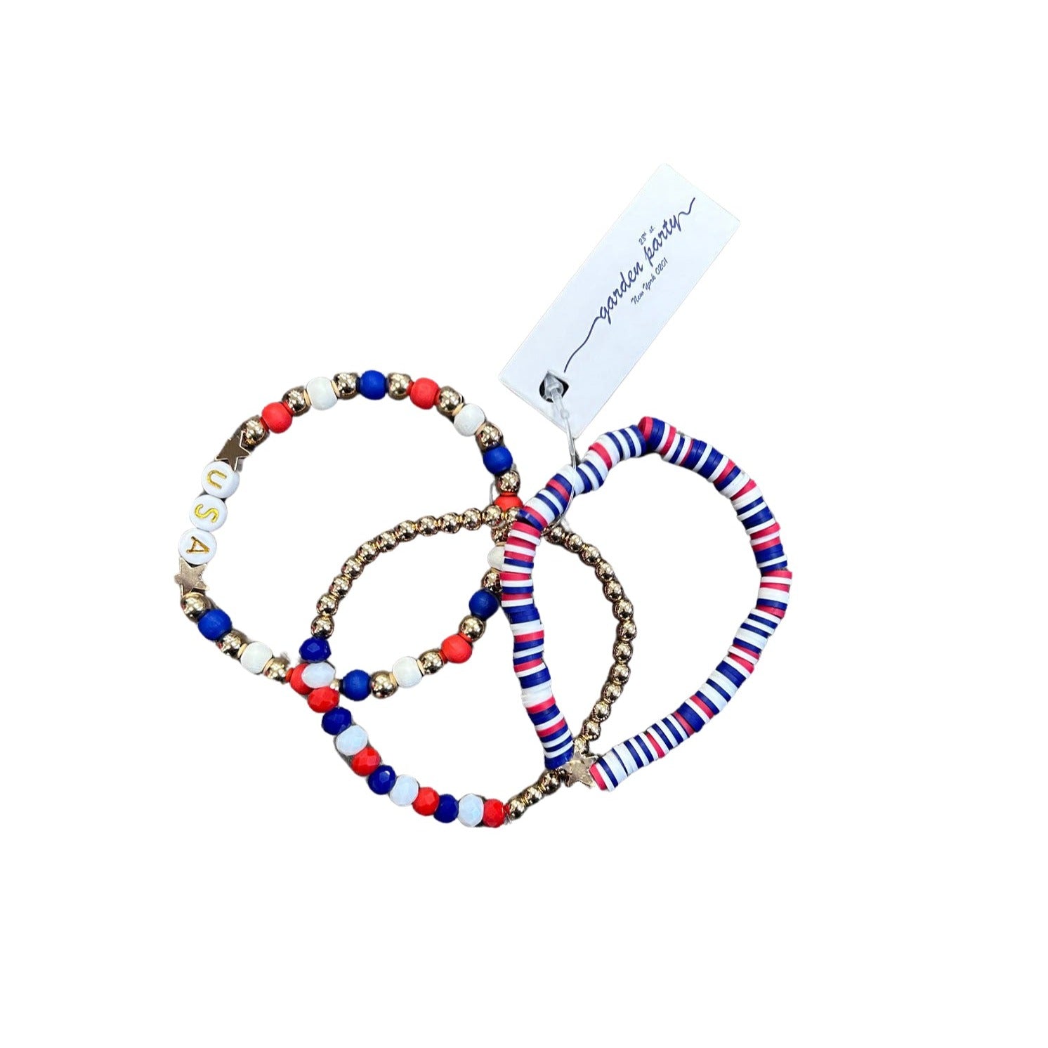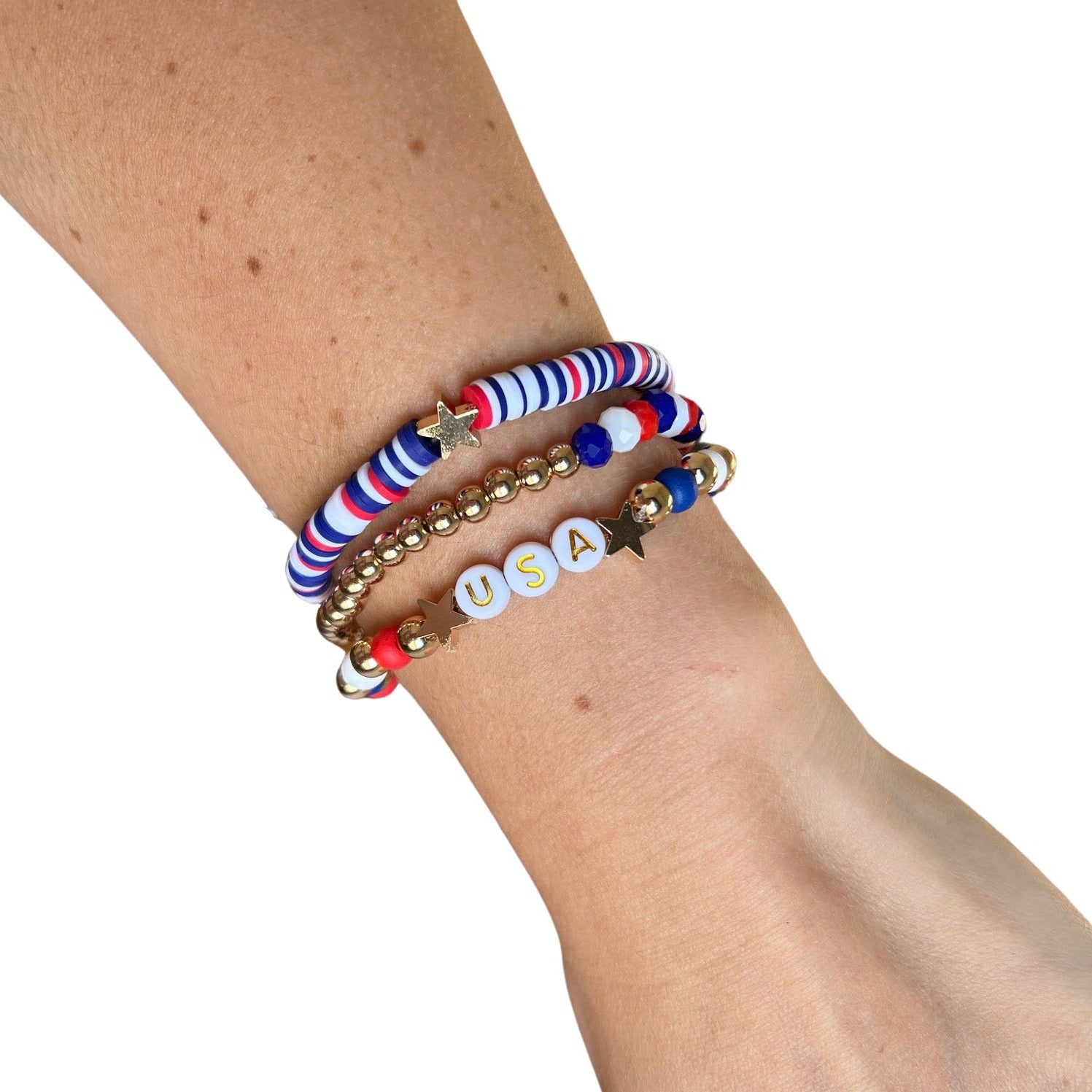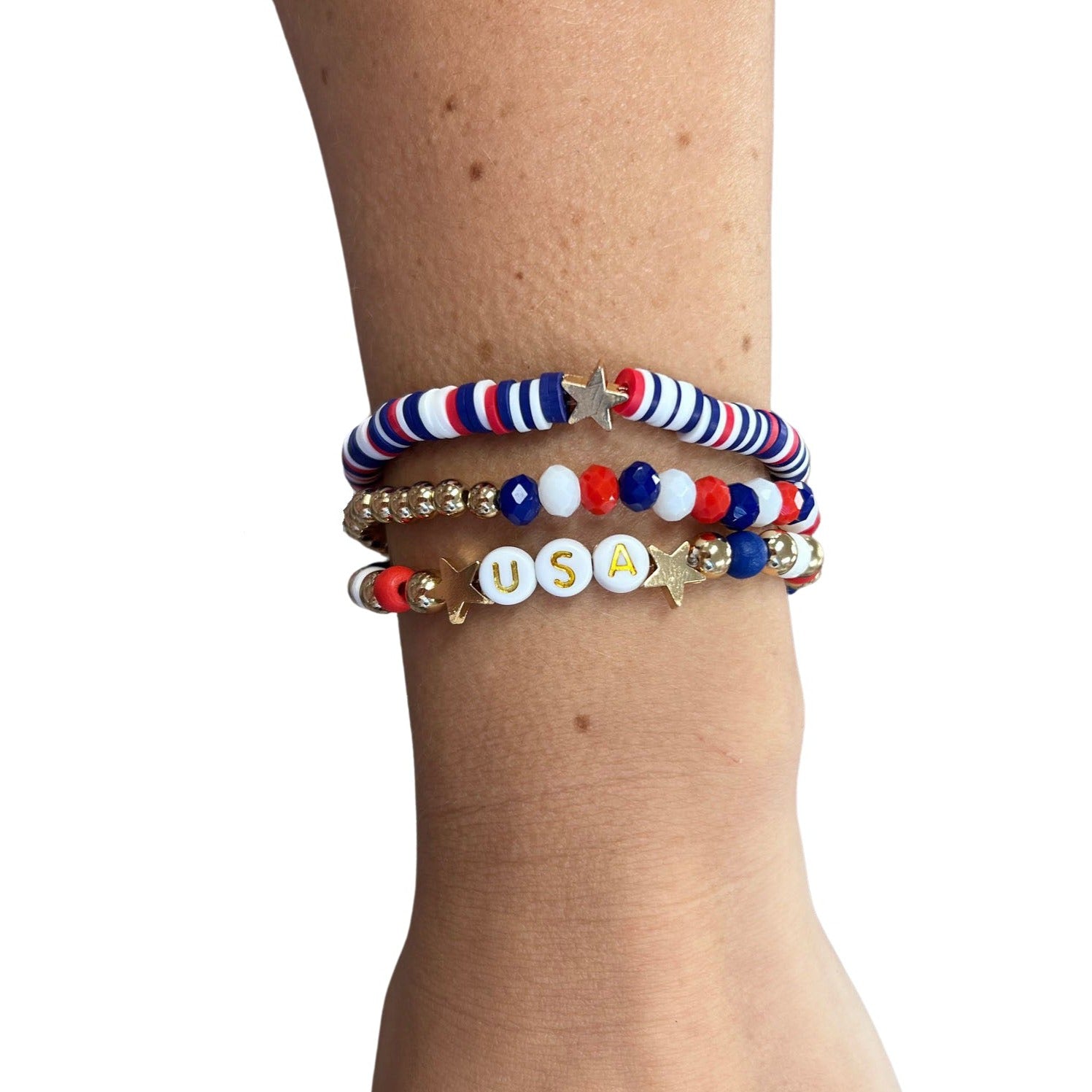Show off your stars and stripes with this USA Red, White, & Blue Fimo beaded bracelet 3 pack! Each stretchy bracelet features vibrant gold tones and is adorned with patriotic symbols, making it the perfect accessory for your 4th of July celebration. Embrace your American pride in a fun and fashionable way!