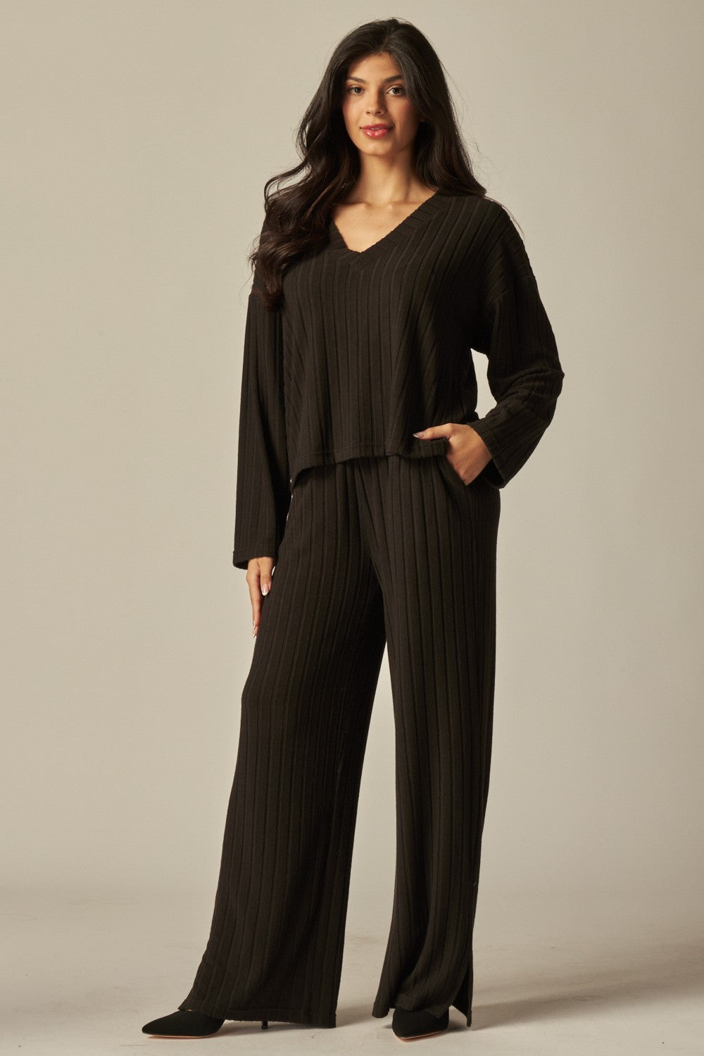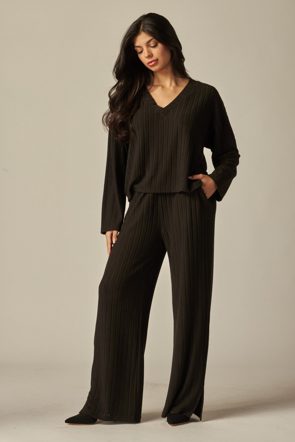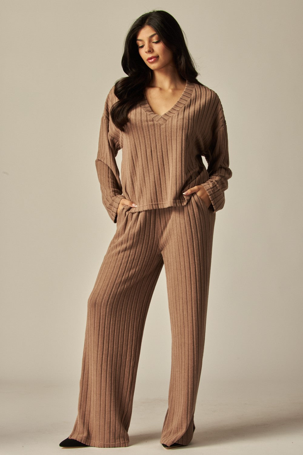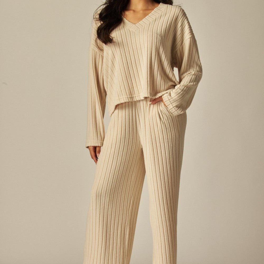 V-Neck Long Sleeve 2 Piece Ribbed Lounge Set - In 4 Colors