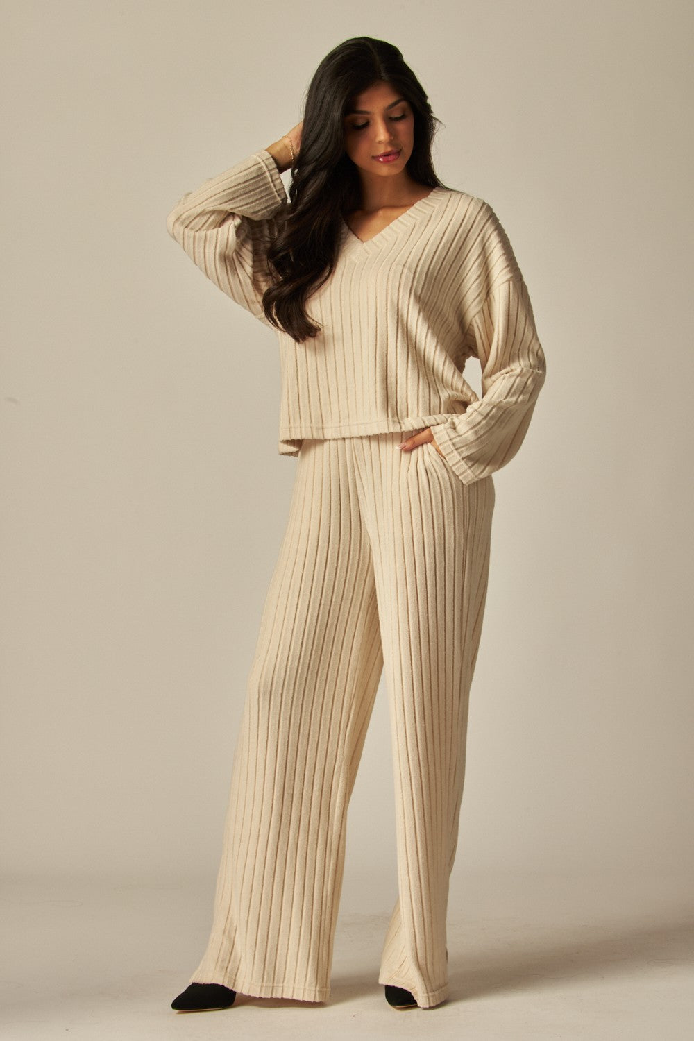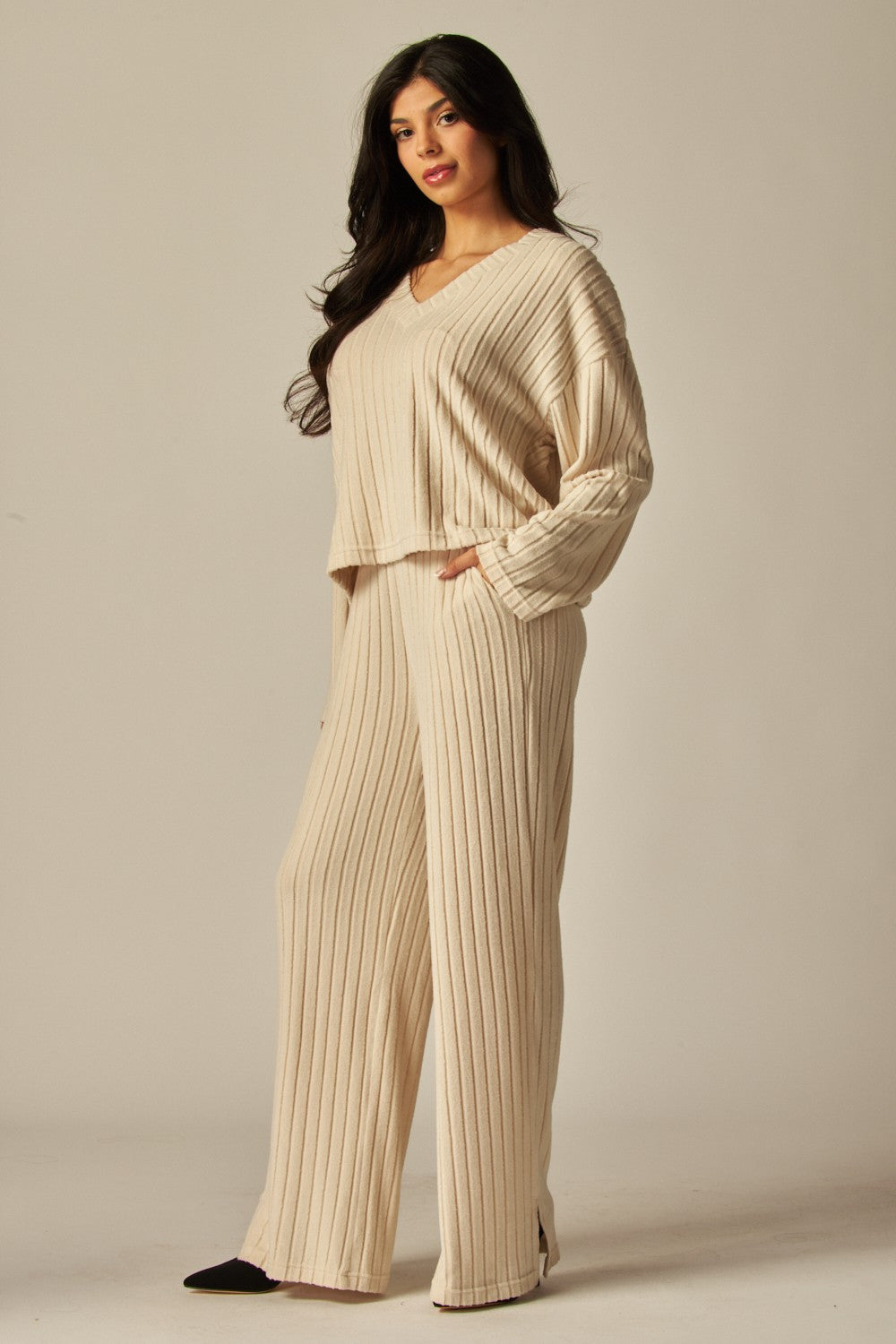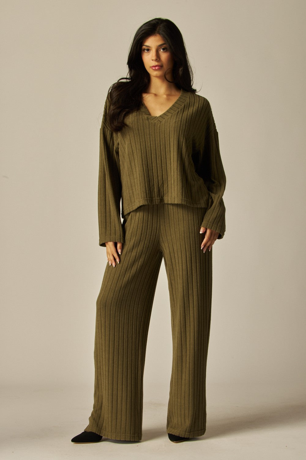 V-Neck Long Sleeve 2 Piece Ribbed Lounge Set - In 4 Colors
