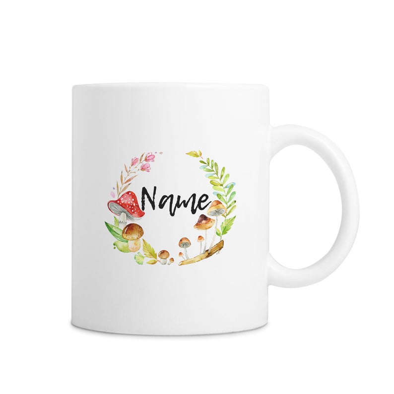 White Custom Name Mug With Woodland Mushrooms