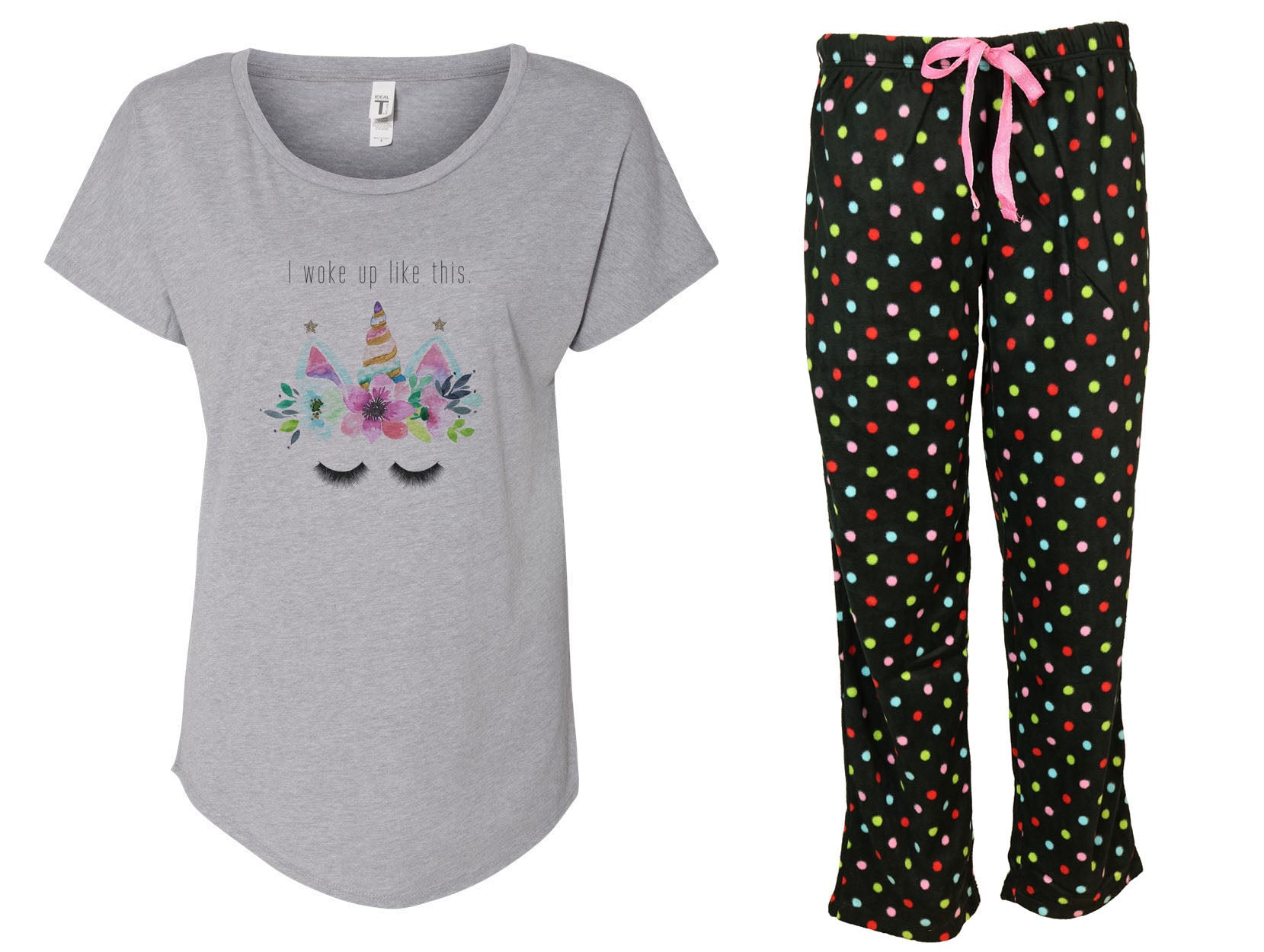 Woke Up Like This Unicorn Pajama Set With Polka Dot Fleece Pants